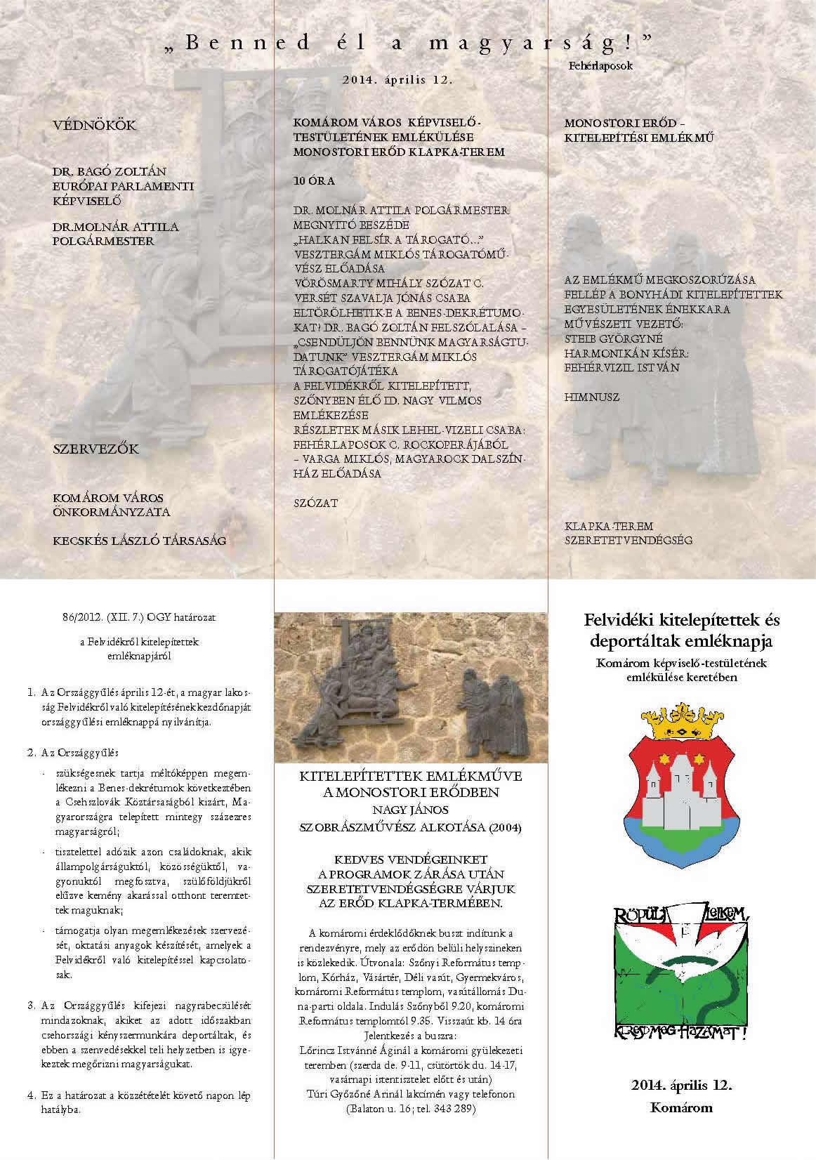 317 igen szavazattal, ellenszavazat nélkül, hét tartózkodás mellett az Országgyűlés még 2012-ben megszavazta, hogy ezentúl április 12. a Felvidékről kitelepített magyarok emléknapja legyen. A törvény alapjául szolgáló előterjesztést dr. Molnár Attila polgármester, országgyűlési képviselő nyújtotta be.