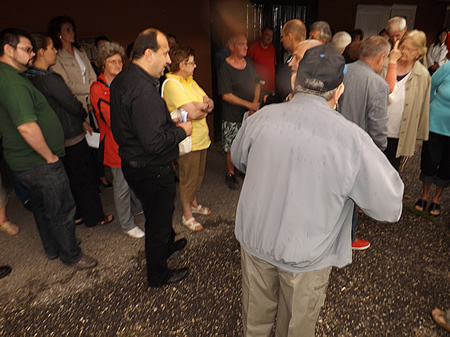 Az eső sajnos bekényszerítette a résztvevőket az egyik tömb alá, a lakók itt mondták el észrevételeiket az illetékeseknek, akik az időjárás kedvezőbbre fordultával személyen is megtekintették a környéket.