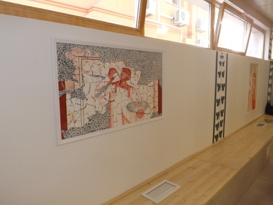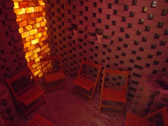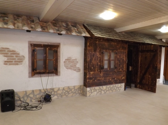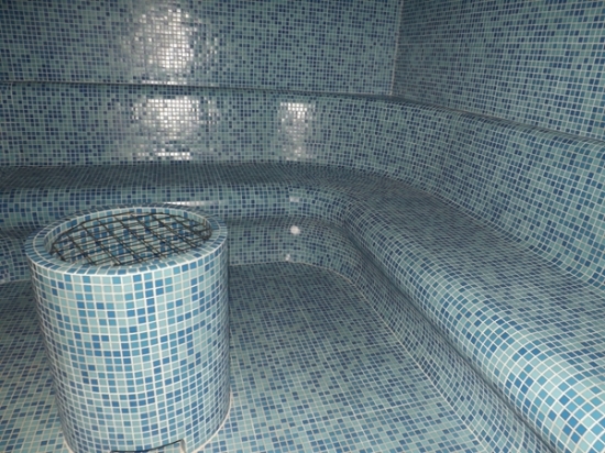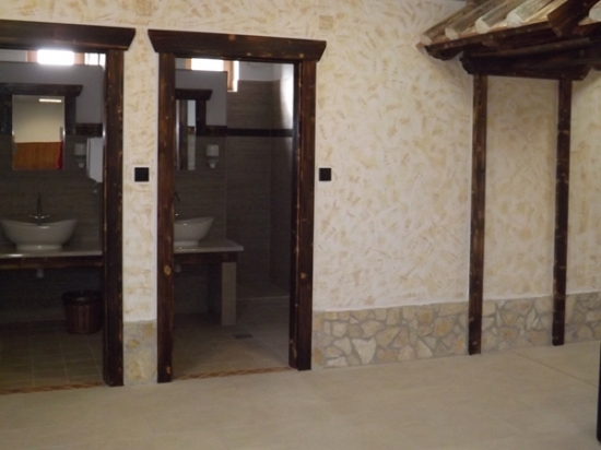 Ahogy már a rönkszaunát övező kertnél is, úgy a most átadott belső térnél is a természetes anyagok dominálnak és visszaköszön az ókori római hangulat is.