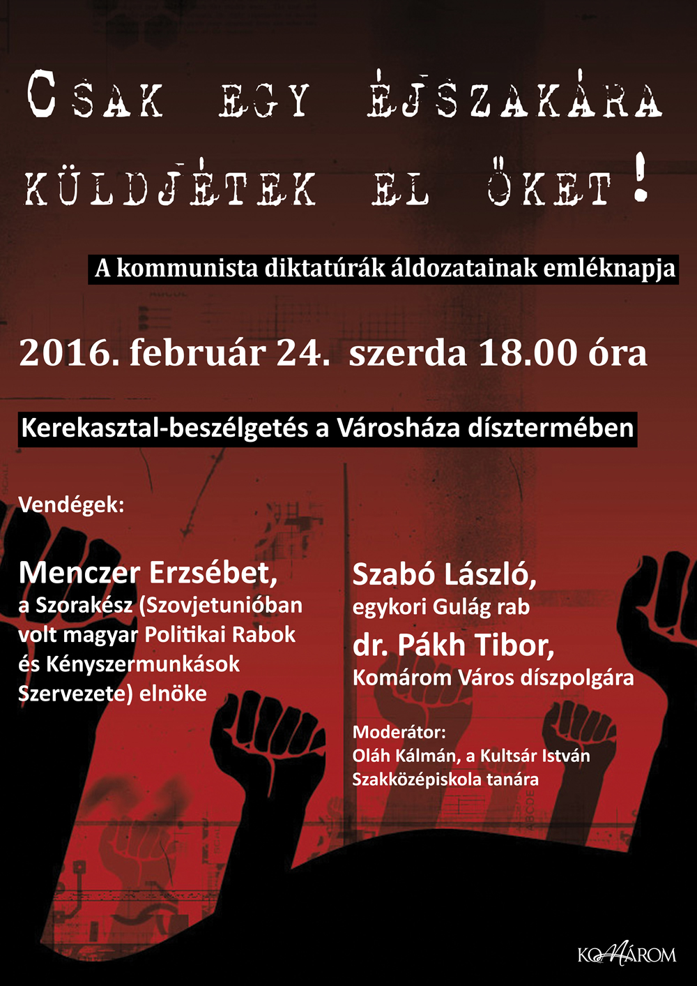 A kommunista diktatúrák áldozatainak emléknapja - 2016. 02. 24. szerda, 18.00 óra, a Városháza díszterme.