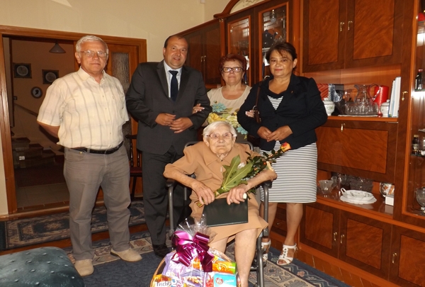 Az ünnepelt miniszterelnöki köszöntőlevelet, és ajándékcsomagot vehetett át.