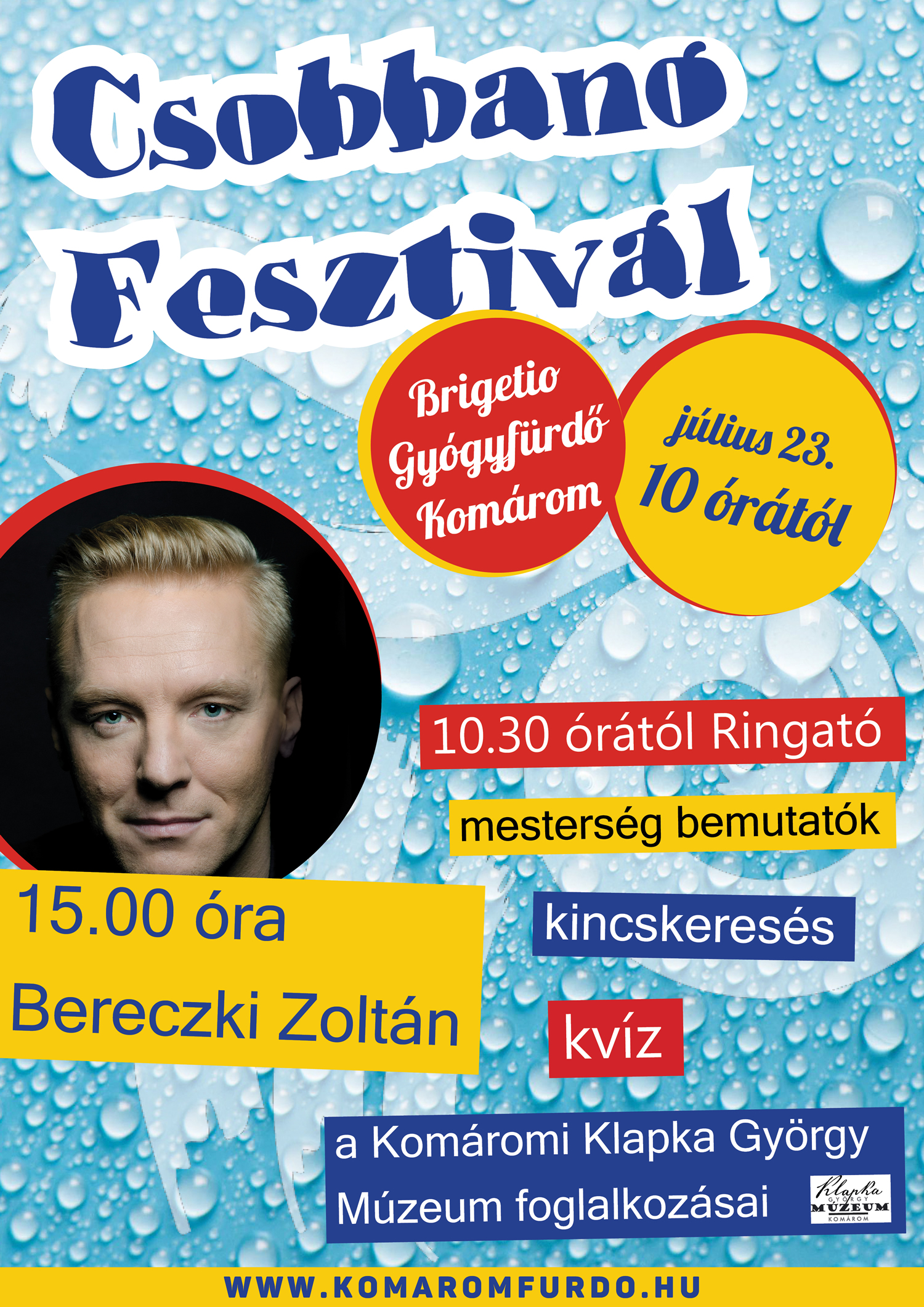 Csobbanó Fesztivál a Brigetio Gyógyfürdőben. 2016. július 23. szombat, 10.00 órától. Szátrvendég: Bereczki Zoltán! További programok a plakáton!