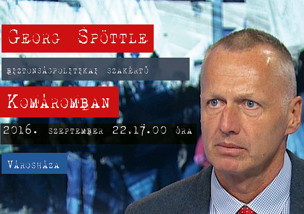 Georg Spöttle, biztonságpolitikai szakértő Komáromban, 2016. szeptember 22. csütörtök, 17.00 óra, Városháza, Díszterem. Téma: Európa és a migráció. A rendezvény ingyenes!