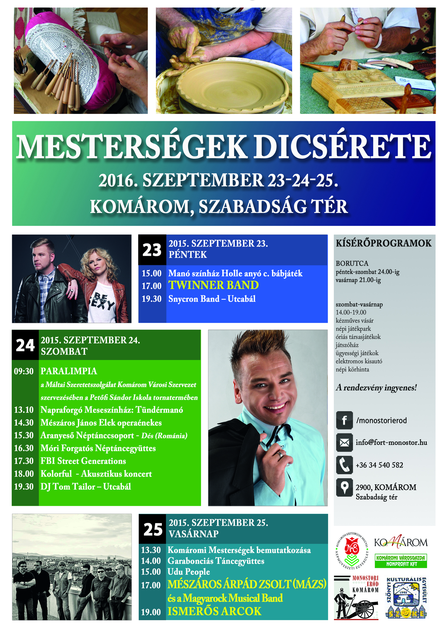 A hétvégén ismét várja a kedves érdeklődőket a Mesterségek dicsérete. Felnőtt és gyermekprogramok, előadások, koncertek, vásár, kézműves foglalkozások, népi körhinta, borudvar, játszóház a Szabadság téren!