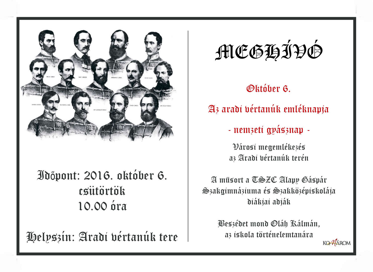 Időpont: 2016. október 6. csütörtök 10.00 óra Helyszín: Aradi vértanúk tere