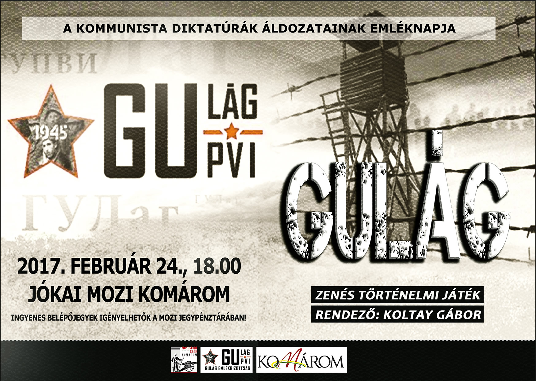 Február 24-én, este 18 órakor mutatják be a Gulág című zenés történelmi játékot a Jókai moziban, Koltay Gábor rendezésében. A darabbal a kommunista diktatúrák áldozataira emlékezünk. Az előadás ingyenes!