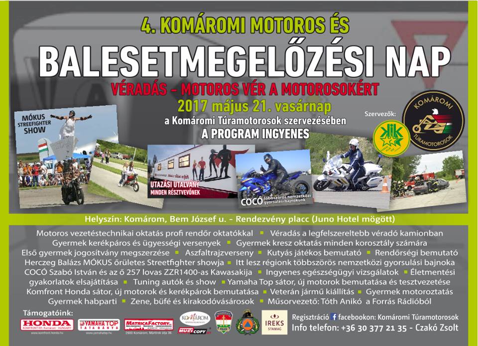- motoros vezetéstechnikai oktatás profi rendőr oktatókkal - véradás - gyermek kerékpáros és ügyességi versenyek - gyermek kresz oktatás minden korosztály számára - első gyermek jogosítvány megszerzése - aszfaltrajz verseny - kutyás bemutató - rendőrségi bemutató - Herczeg Balázs "MÓKUS2 streetfighter showja - érkezik régionk többszörös nemzetközi gyorsulási bajnoka "COCÓ" Szabó István és az ő 257 lovas ZZR1400-as Kawasakia - ingyenes egészségügyi vizsgálatok - életmentési gyakorlatok - tuning autók és tuning show - Yamaha Top sátor, új motorok bemutatása és tesztvezetése - Konfront Honda sátor, új motorok és kerékpárok bemutatása - veterán jármű kiállítás - gyermek motoroztatás - gyermekhabparti - zene, büfé és kirakodó vásárosok
