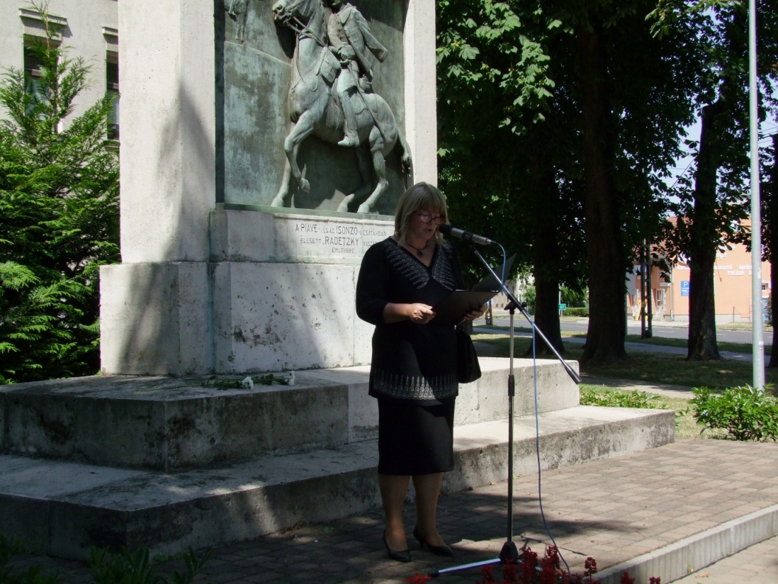 - Ezen intenciókat követve gyűltünk most össze, hogy emlékezzünk a Radetzky-huszárokra és azokra a tiszteletet érdemlő felmenőinkre, akik annak reményében küzdöttek az olasz frontokon, hogy a boldog békeidők visszahozhatók. Így emlékezem én is nagyapámra, aki két lövés következtében rokkantan, de hazatért. Ezért állhatok magam is itt - mondta emlékező beszédében Udvardyné dr. Mühlenkampf Erika, a Jókai Mór Gimnázium igazgatónője.