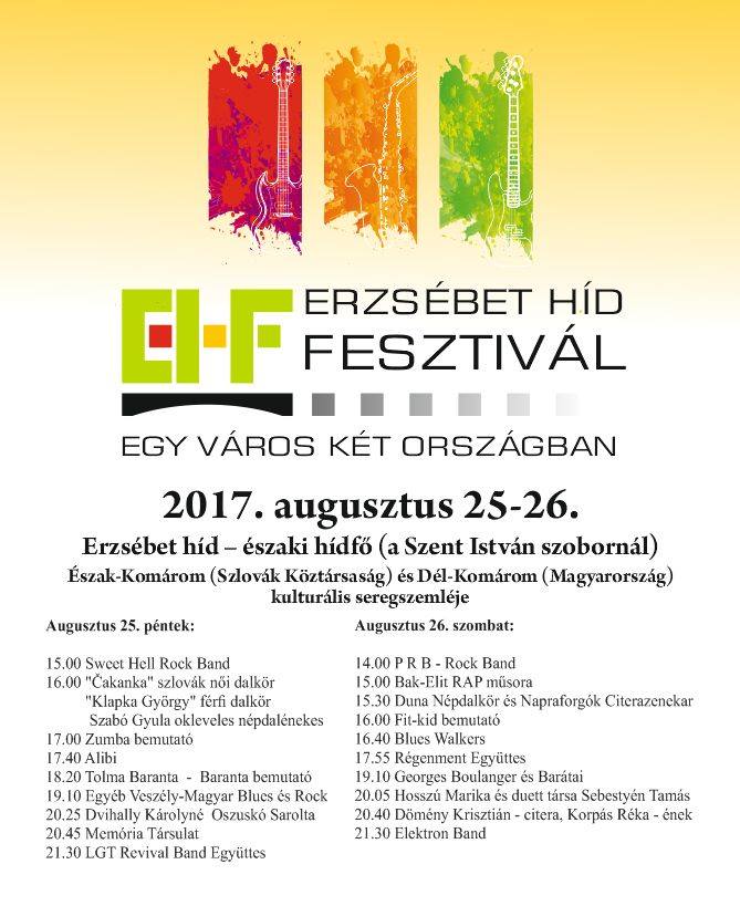 A határon átnyúló kapcsolatok-, a „Komárom egy város” érzés erősítése, továbbá a korosztályok és művészeti ágak sokszínűségének bemutatása céljából az Endresz Csoport (Magyarország) és az Egy Jobb Komáromért Polgári Társulás (Szlovákia) augusztus 25-26-án idén is megrendezi az Erzsébet híd Fesztivált, Észak- és Dél-Komárom kulturális seregszemléjét az Erzsébet híd északi hídfőjénél.