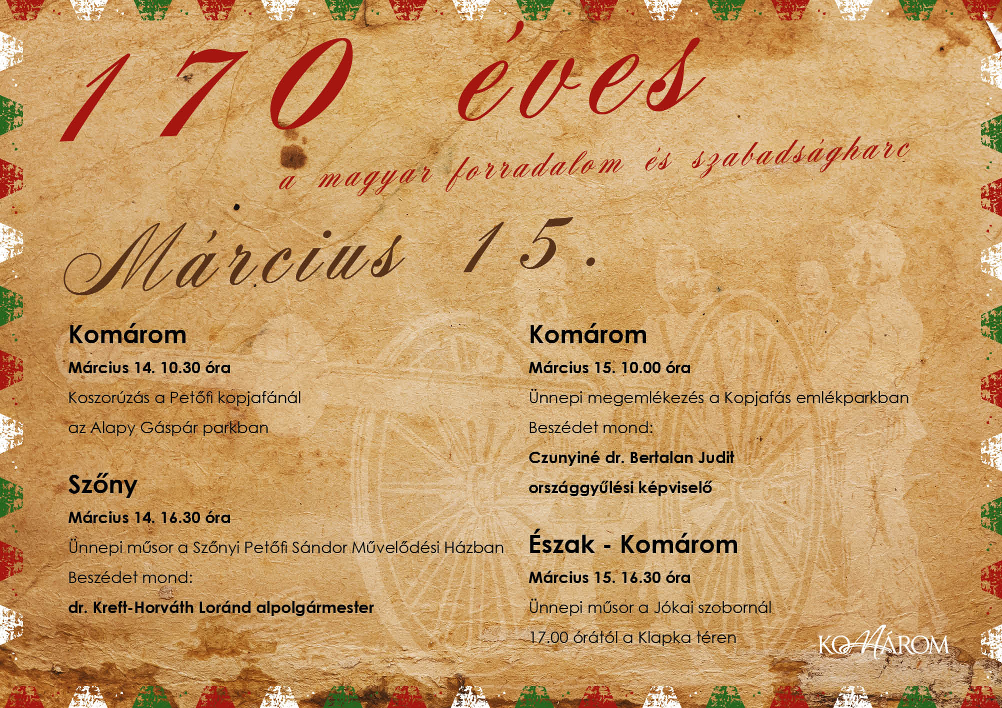 A hagyományokhoz híven idén is több helyszínen, több időpontban is megemlékezünk az 1848 / 49-es forradalom és szabadságharc hőseiről.