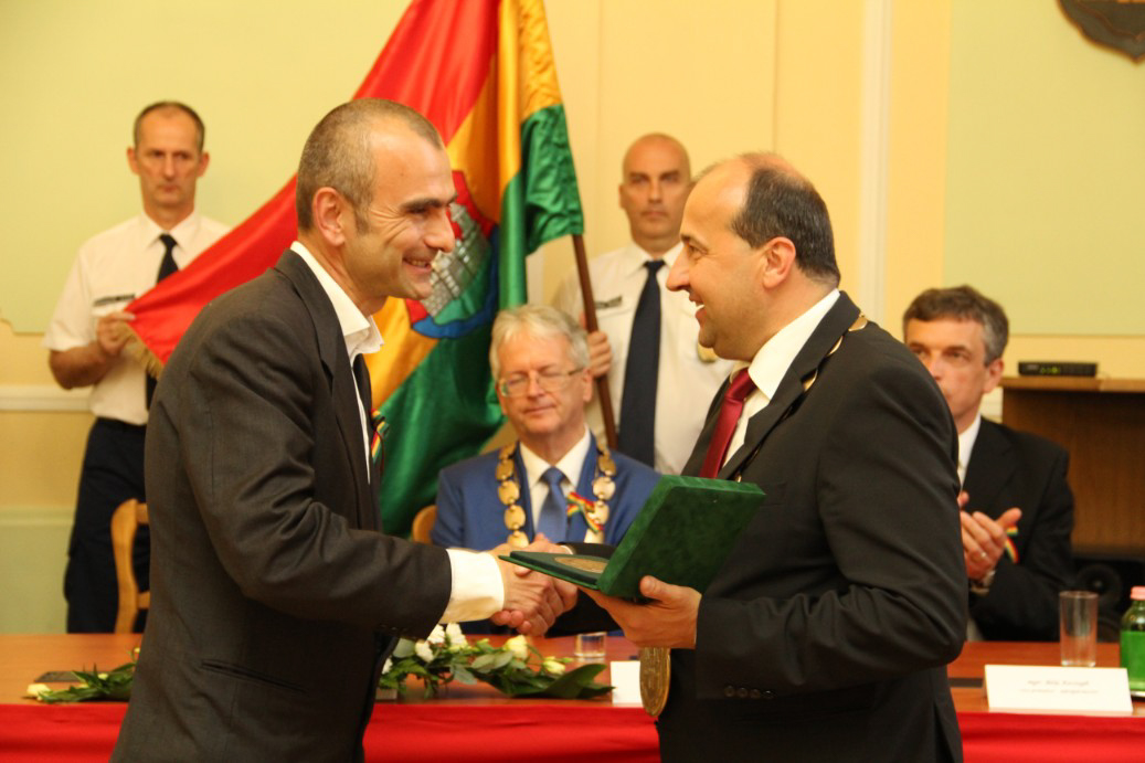 Észak- és Dél-Komárom képviselő testületei április 26-án, a komáromi csata emléknapján idén is megtartották együttes ünnepi testületi ülésüket, ezúttal a Duna déli partján, a Városháza dísztermében. A hivatalos ceremónián került sor a díszpolgári kitüntető cím, a Pro Urbe-, valamint a polgármesteri díjak átadására.