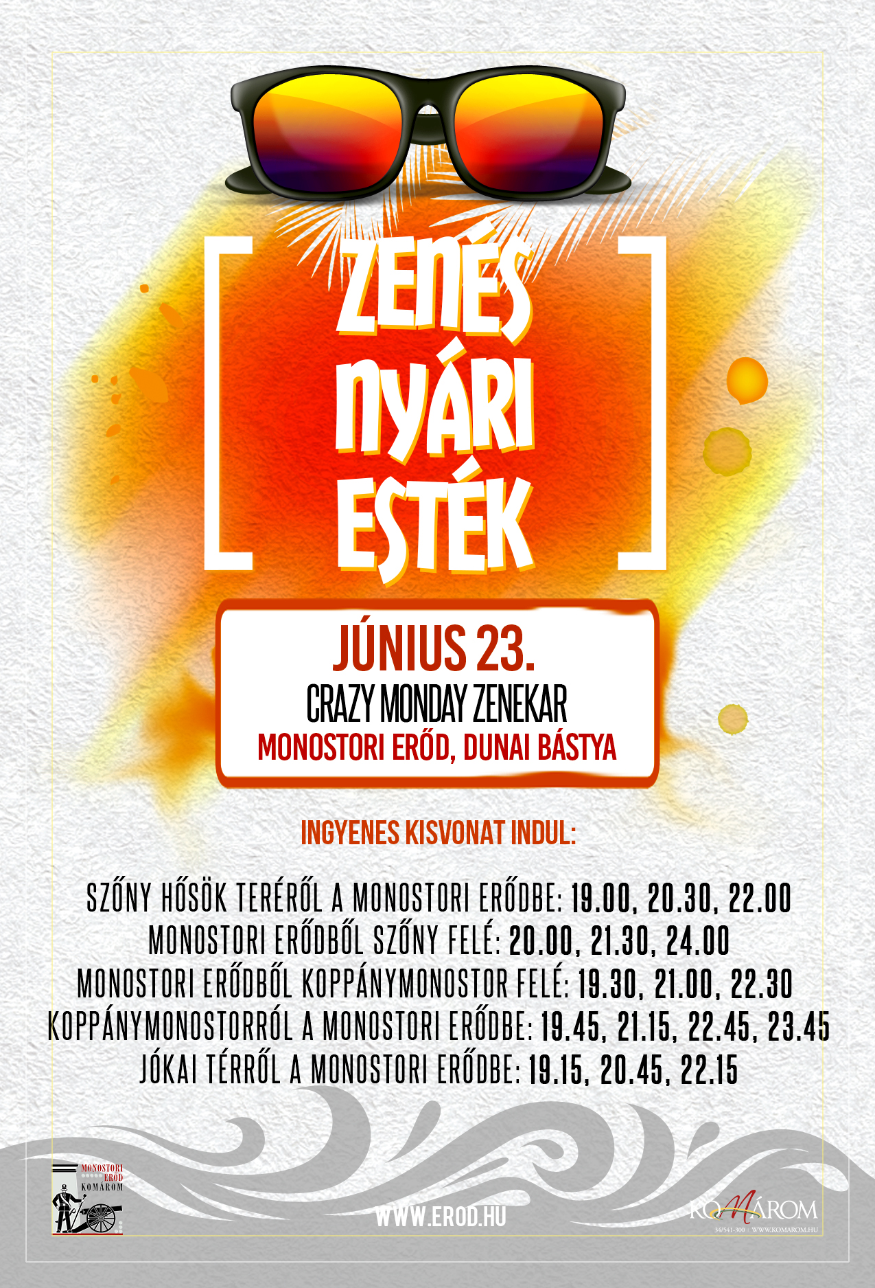 Szintén szombaton 20.00 órától tartják a Zenés Nyári Esték elnevezésű programot a Dunai Bástya előtti területen, ahol a Crazy Monday zenekar koncertezik.