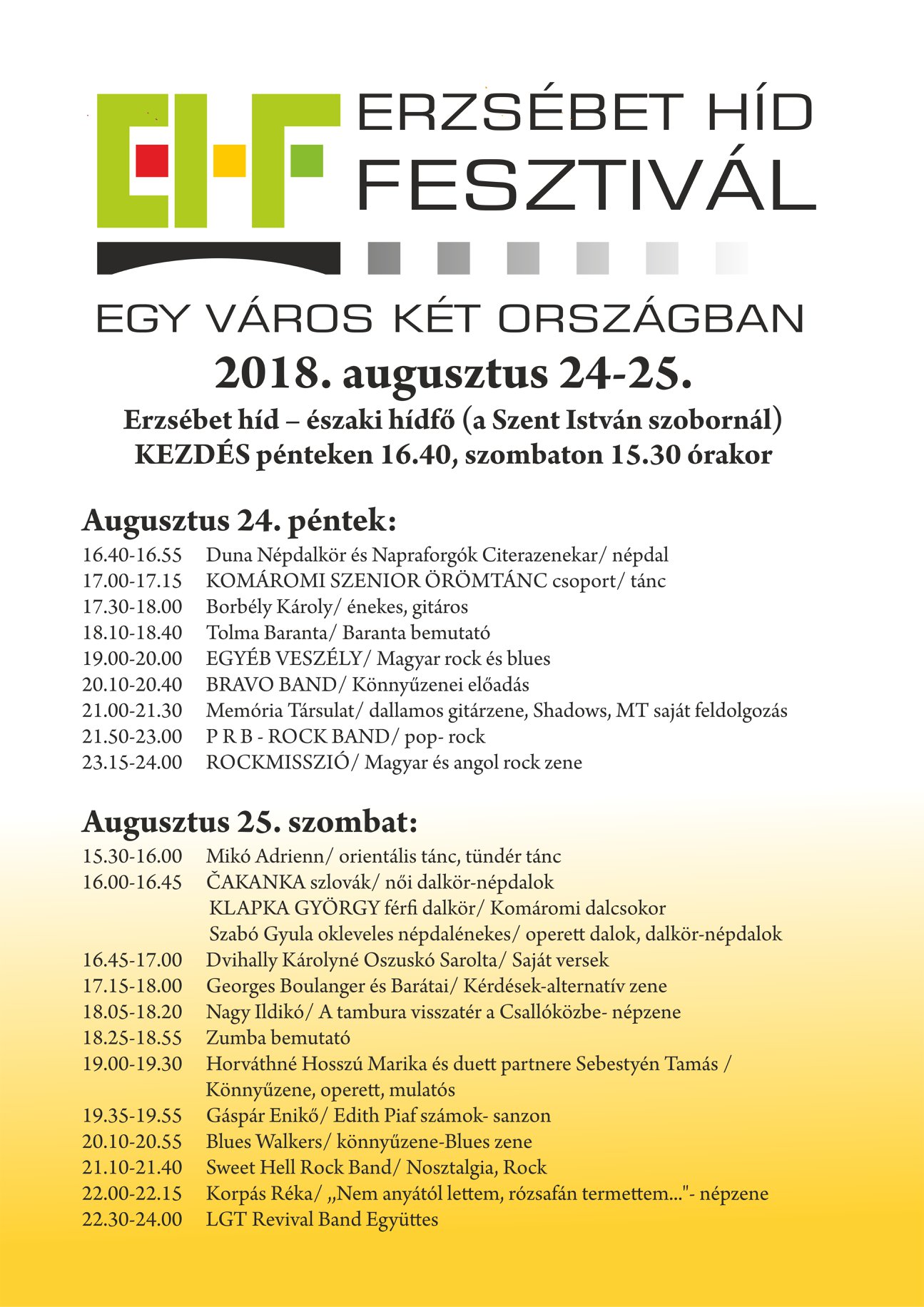 „Komárom egy város” érzésének, illetve az egy nemzethez való tartozásnak az erősítése, továbbá a korosztályok és művészeti ágak sokszínűségének bemutatása céljából az Endresz Csoport Egyesület (Magyarország) Erzsébet híd Fesztivál címmel együttműködve az Egy Jobb Komáromért Polgári Társulással (Szlovákia) 2018. augusztus 24-25-én (péntek-szombat) ismét megrendezi Észak-Komárom és Dél-Komárom magyarságának kulturális seregszemléjét.