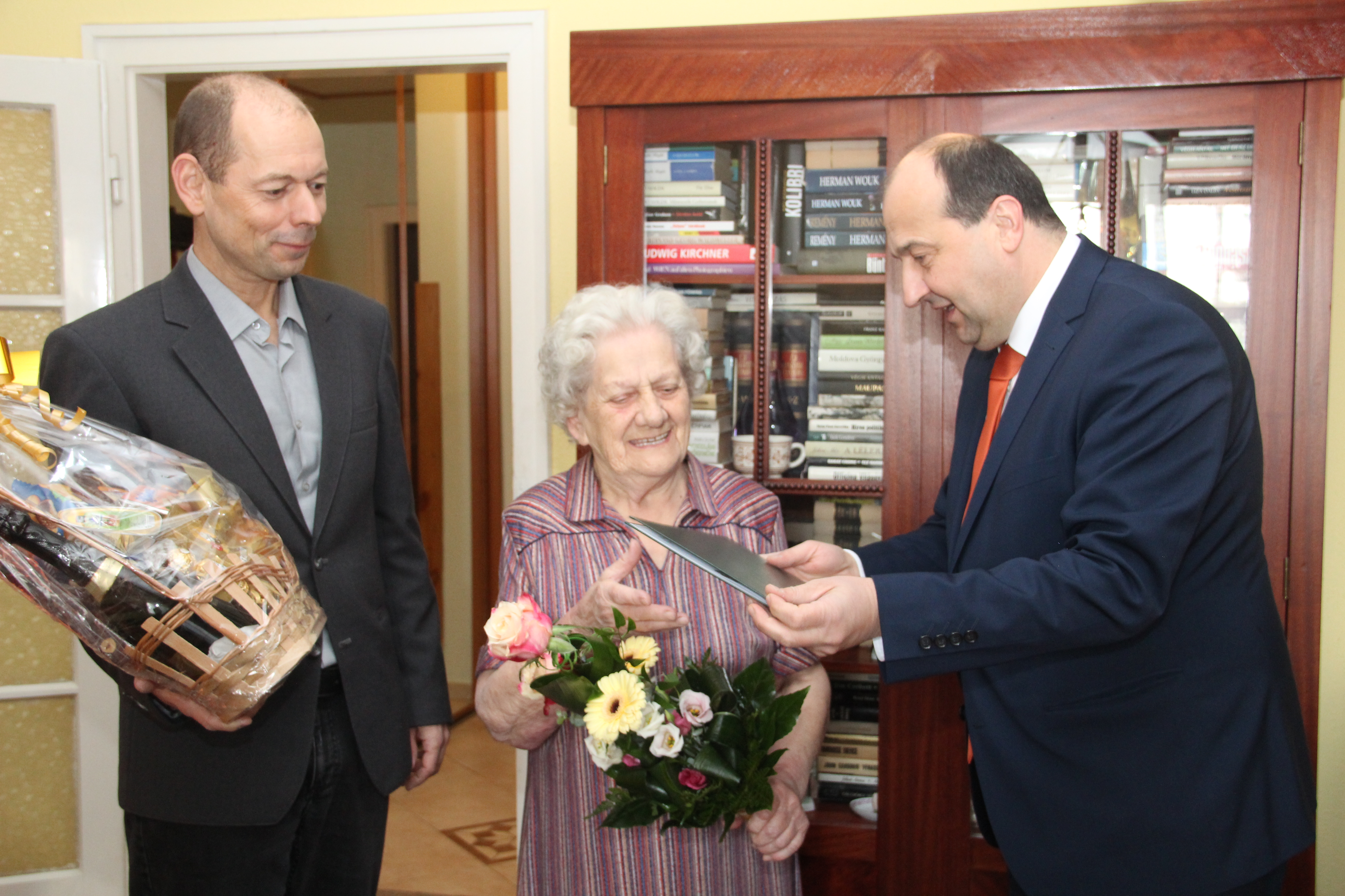 Az ünnepelt ezúttal is virágcsokrot, ajándékkosarat és miniszterelnöki köszöntő-levelet vehetett át.